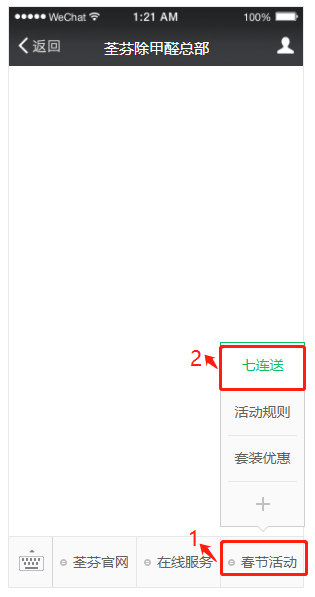 通過微信公眾號,荃芬除甲醛總部:底部菜單>春節七連送